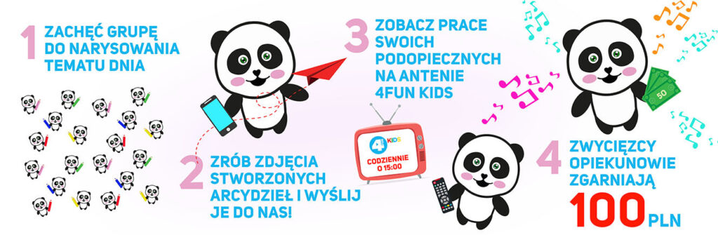 Co tydzień naszą antenę oddajemy w ręce innego przedszkola, im więcej prac prześle TWOJA grupa tym większa szansa, że właśnie Was wyróżnimy na antenie 4FUN KIDS, a opiekun zgarnie 100PLN!